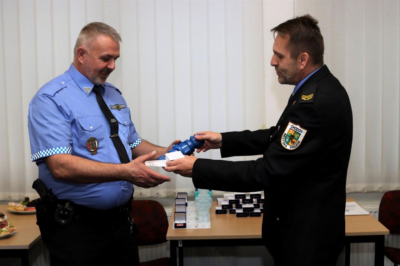„Pamětní stužkou za věrnost jsme ocenili pětici zakládajících členů městské police v Chodově, kteří tak oslavili 30 let služby. Přejeme jim do dalších let hlavně hodně zdraví, pevné nervy a co nejklidnější výkon služby,“ popřál kolegům velitel chodovských strážníků Ladislav Staněk.