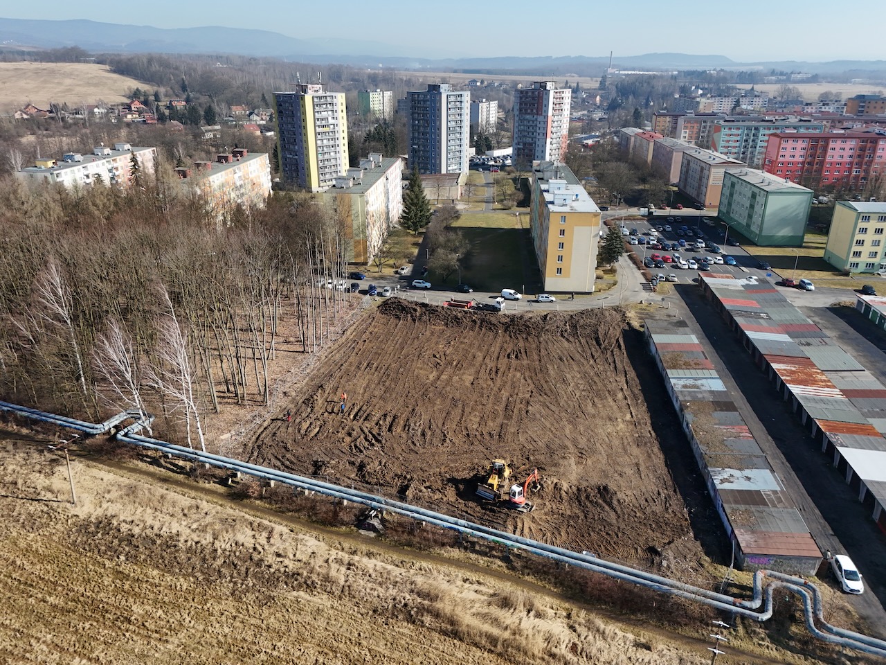 Na stavbě je nyní těžká technika, která provádí terénní úpravy. V místě je třeba procházet a projíždět s opatrností.